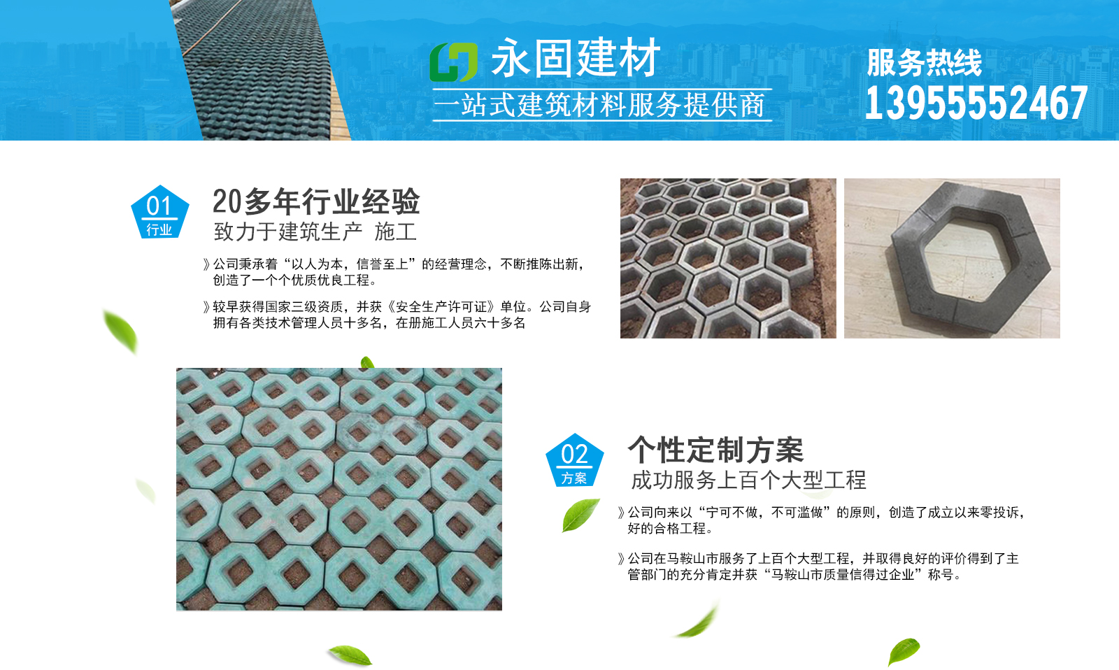 馬鞍山市永固建材有限公司,成立于一九九六年六月。公司秉承著“以人為本,信譽至上”的經營理念,不斷推陳出新,創造了一個個優良工程。較早獲得國家三級資質,并獲《安全生產許可證》單位。公司自身擁有各類技術管理人員十多名,在冊施工人員六十多名,公司向來以“寧可不做,不可濫做”的原則,創造了成立以來零投訴,好的合格工程。得到了主管部門的充分肯定并獲“馬鞍山市質量信得過企業”稱號。我們從戰略高度審視市場,創造性開展各項工作,在建筑裝飾行業中,力爭做到人無我有,人有我精,在保證硬件實施的同時,注重軟件環境的建設,按現代企業制度的要求,樹立誠信的企業理念,推進企業的管理向系統化、正規化、制度化邁進;為創造好的企業、優異的效益、好的管理打下堅實的基礎。我們把企業的發展、回報客戶和社會當做首要務,我們追求優良品質,將以至誠至美的團隊協作精神誠信服務,竭誠為廣大客戶提供完善的服務。
